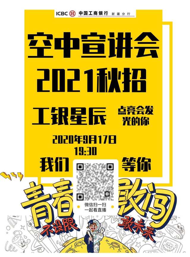 工商银行新疆分行将于明天下午19:30召开秋招宣讲会,会对招聘相关进行在线宣讲解答~ 扫码即可观看!