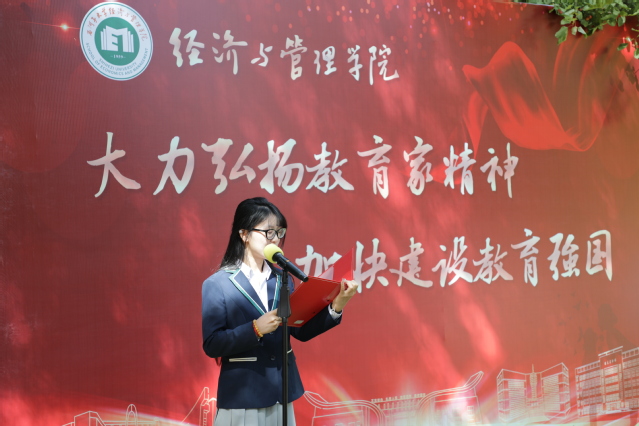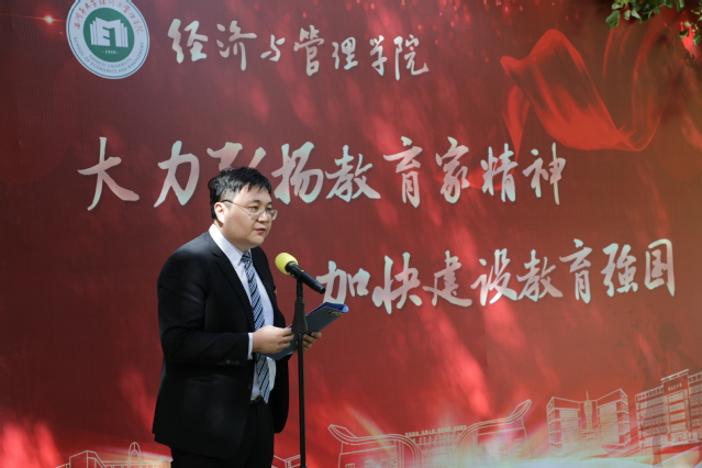 随后,优秀青年教师代表张记元上台发言,他通过会计恒等式的比喻,阐述了教师的意义和价值,并强调了团体和集体力量的重要性,增强了教师团队的凝聚力。新进教师代表孟征也分享了他对教师这一岗位的理解,并表明了他做好新工作的坚定决心,赢得了在场师生的热烈掌声。随后,学生代表通过回顾个人的校园生活,表达了对老师的敬意与感激,并代表全体同学向老师们致以真挚祝福。